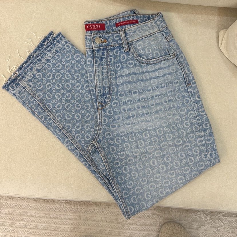 Guess kadınlar için baskılı desenli, düğmeli, bol kesim mavi denim jean. Normal midi boyda, salaş ve şık yırtık detaylı. Temizdir birkaç kez giyfim sadece orjinaldir