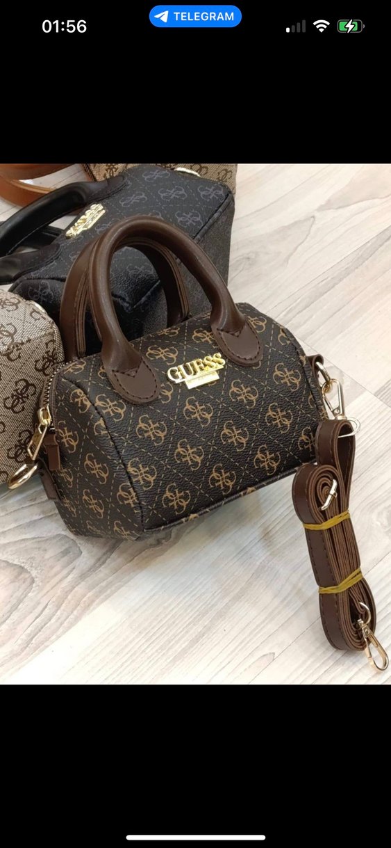 Kahverengi deri Guess çanta, baskılı desene ve parlak görünüme sahiptir. Tokalı detayları ve çıkarılabilir askısı ile trend sokak stiline uygundur.