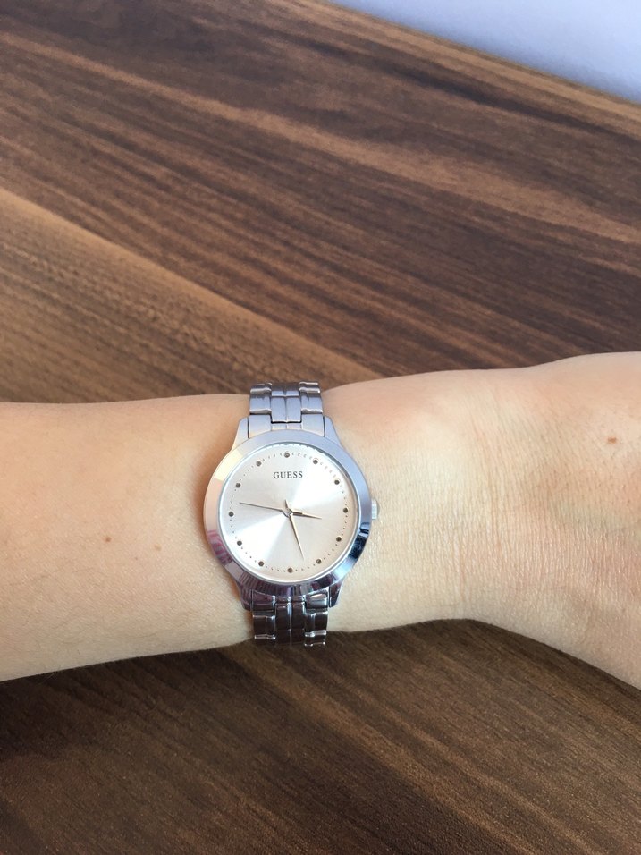 Guess marka, parlak, minimalist tasarımlı, tokalı gümüş metal kayışlı kadın saati