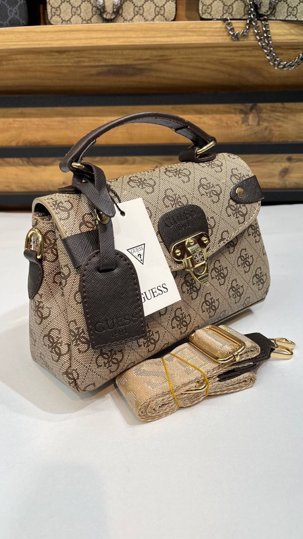 Guess markalı, kahverengi ve gri tonlarda baskılı deri kadın çanta, tokalı kapanış ve çıkarılabilir askıyla klasik şıklığı yansıtıyor.