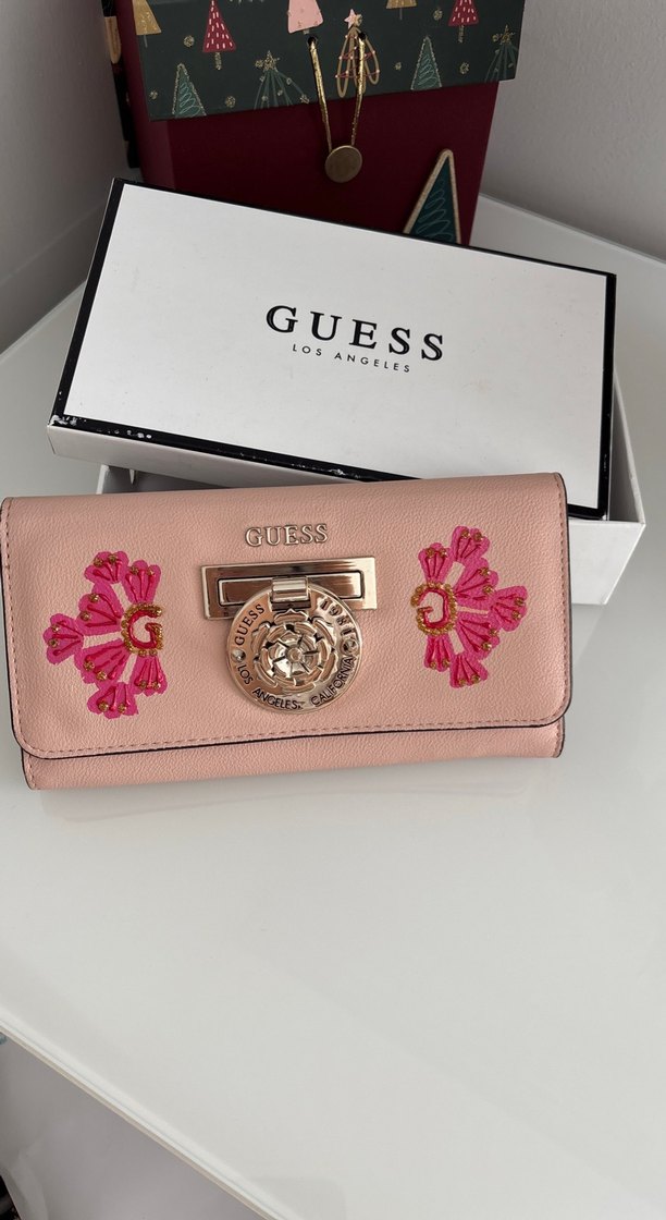 Guess marka, nakışlı çiçek detaylı, tokalı, pastel pembe deri kadın cüzdan. Modern klasik ve trend rahat tarzda, günlük kullanıma uygun. Kutusunda.