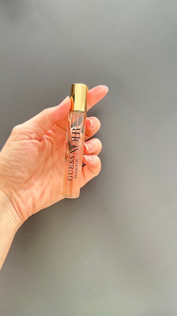 Guess Noir kadın parfümü, 15 ml cam şişede, altın kapaklı, taşınabilir boyda.