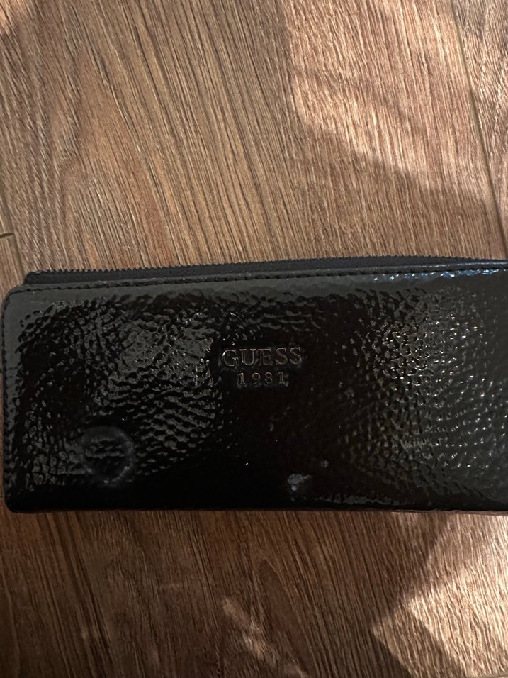 Parlak siyah deri, yılan desenli kadın cüzdanı. Ofis ve iş kullanımı için uygundur. Üzerinde GUESS, 1981 yazısı bulunur.