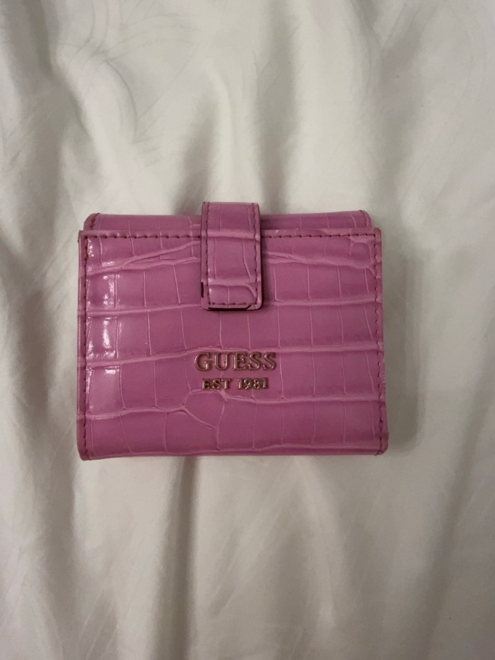 GUESS markalı pastel pembe deri cüzdan, tokalı kapanış ve baskılı desene sahiptir. Paris sokak modası tarzını günlük kullanıma taşır.