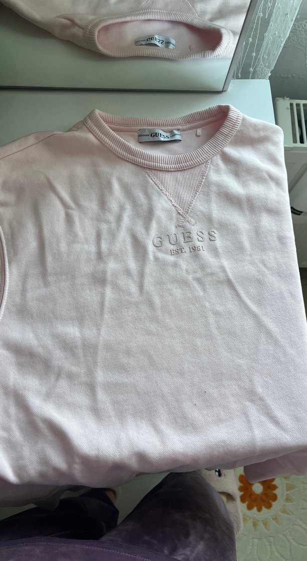 Guess marka, pastel pembe renkte, pamuklu kumaştan, rahat kesim, kısa kollu ve yuvarlak yakalı kadın sweatshirtü, günlük kullanım için şık ve sade bir tercih sunar. Çok az minik bir leke var önünde.