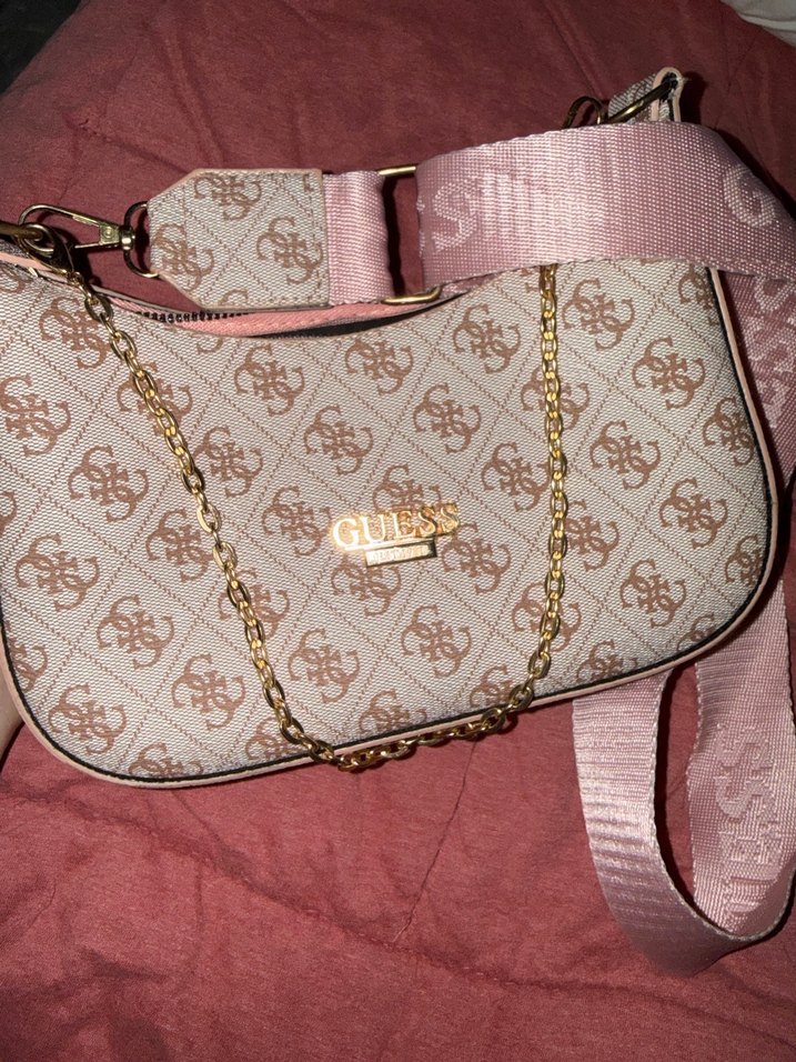 Guess markalı, pudra renkli baskılı kadın çantası, tokalı askıları ve altın zincir detaylarıyla klasik ve sokak stili bir görünüm sunar. Günlük kullanım için uygundur. 2 yıl önce hediye alındı orijinal olup olmadığını bilmiyorum
