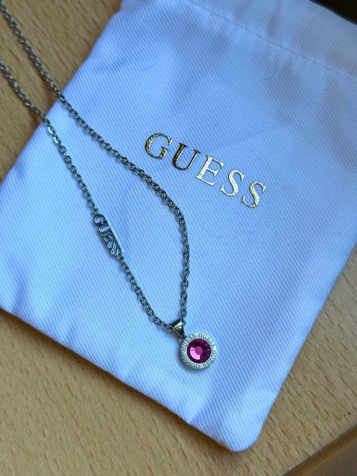 GUESS marka, zincir detaylı, renkli pembe taşlı midi uzunlukta kolye. Minimalist ve karşı kültür tarzına uygun günlük kullanıma uygun. Tüm orijinallik belgeleri duruyor. Önceden hediye gelmişti sayılı taktım, normal fiyatı 3000 civarı