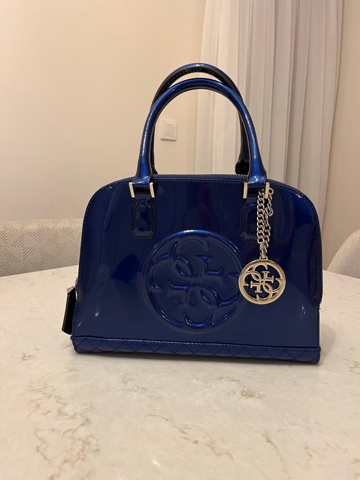Parlak mavi deri kadın çanta, modern klasik tarzda, baskılı logo ve parlak yüzeyli, günlük kullanım için uygun. Hiç kullanılmadı, tertemizdir. Çapraz askı ve toz torbası ile gönderilecektir.