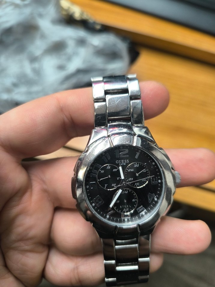 Guess markalı saat, siyah kadran ve çoklu alt kadranlarla birlikte tokalı gümüş metal kordon sunar. Biker tarzını yansıtır. ⌚