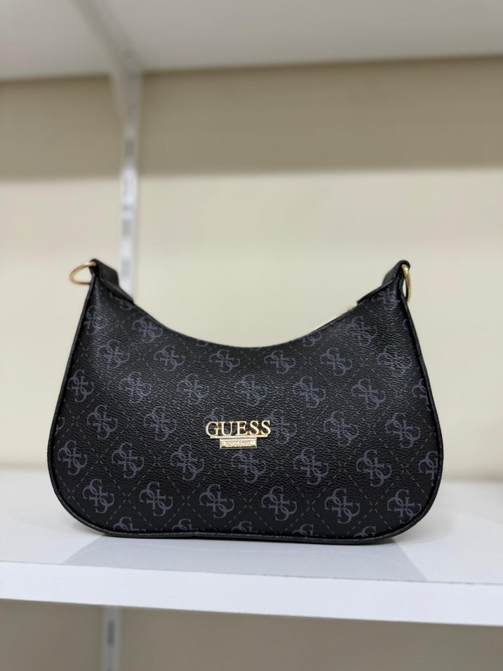 Guess siyah baskılı kadın omuz çantası, parlak yüzey ve tokalı detaylarla, sentetik kumaştan, günlük sokak stiline uygundur.
