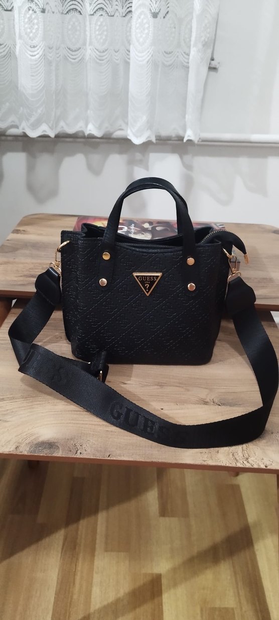 Siyah deri Guess kadın çanta, desenli ve kemerli tasarıma sahiptir. Kulplu ve çıkarılabilir Askılı, markalı kayışlıdır, trend sokak stiline uygundur. 4,5 defa kullanılmıştır.