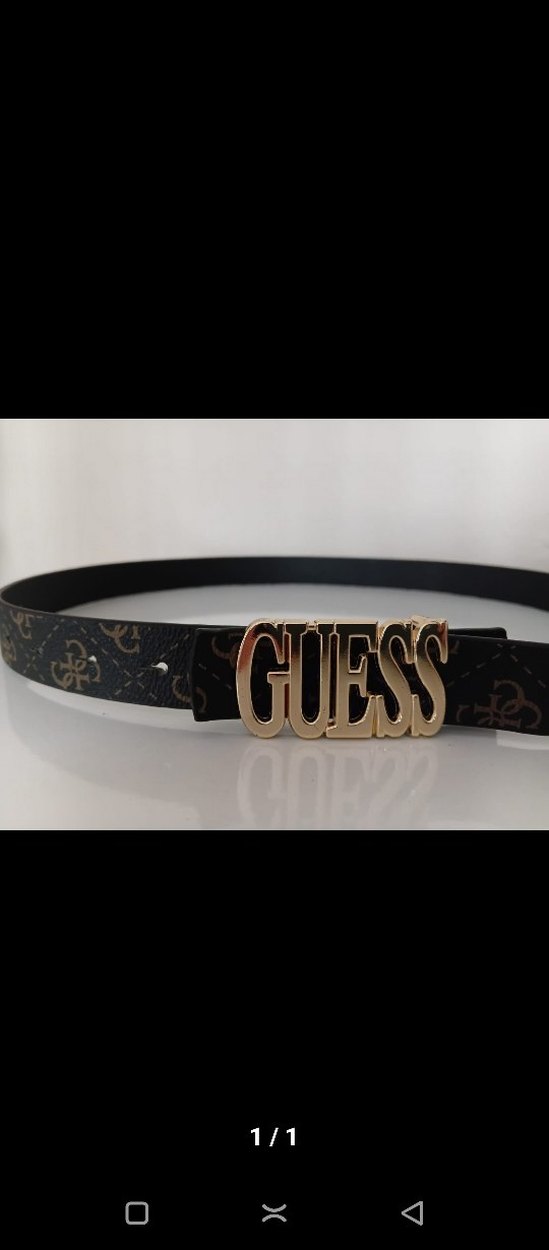 Kadınlar için tasarlanmış koyu renk deri kemer, büyük altın renkli GUESS logosu tokasıyla dikkat çekiyor. ✨