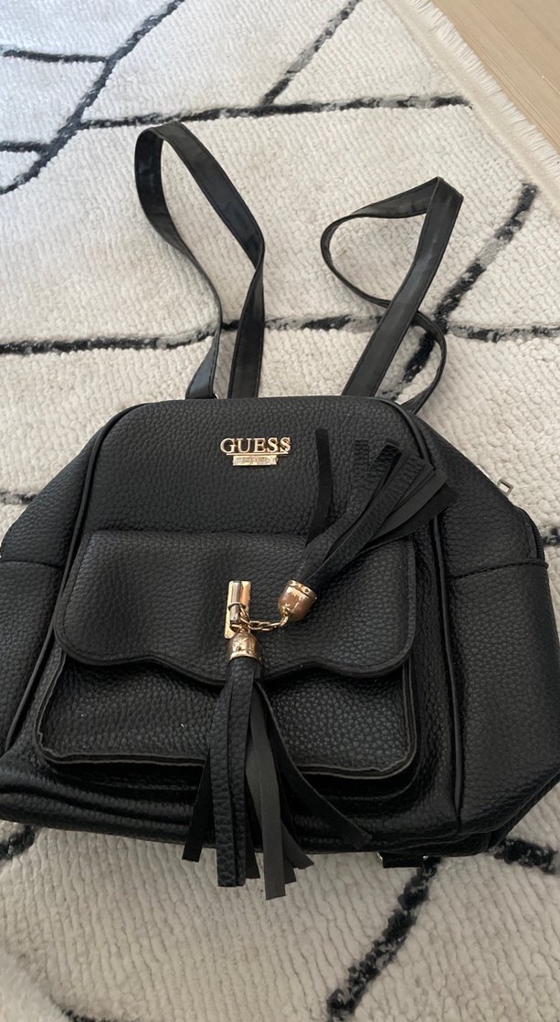 Guess markalı, tokalı detaylara ve baskılı dokuya sahip siyah deri sırt çantası. Günlük kullanıma uygun, trend sokak tarzı.
