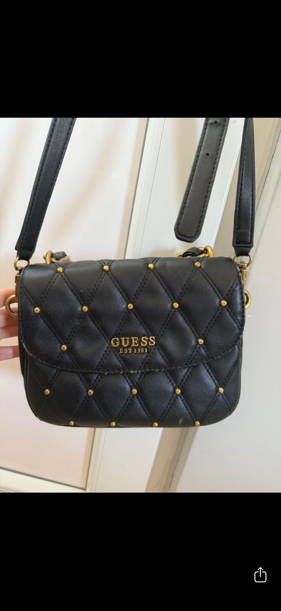 Siyah deri kapitone çanta, altın renkli perçin detaylı ve tokalı askılıdır. Önünde GUESS EST1981 logosu bulunur. Klasik zarafete uygun, günlük kullanıma ideal.