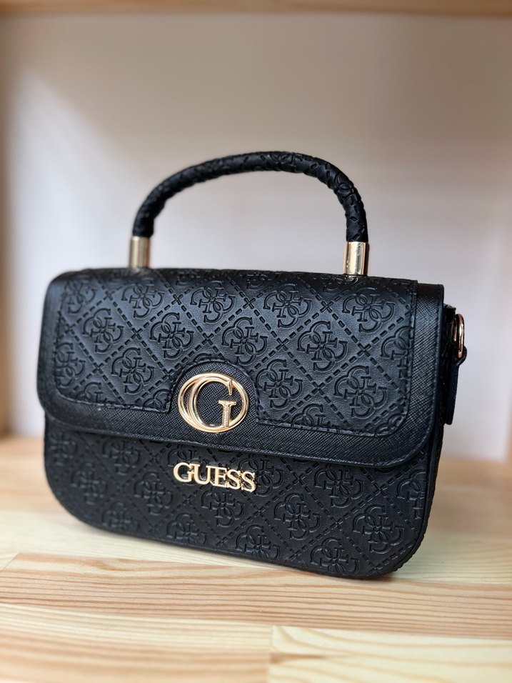 GUESS siyah deri tokalı kadın çanta, parlak yüzeyi ve baskılı deseniyle klasik şıklığı modern tarzla buluşturur. Günlük kullanıma uygundur ve altın detaylar içerir.