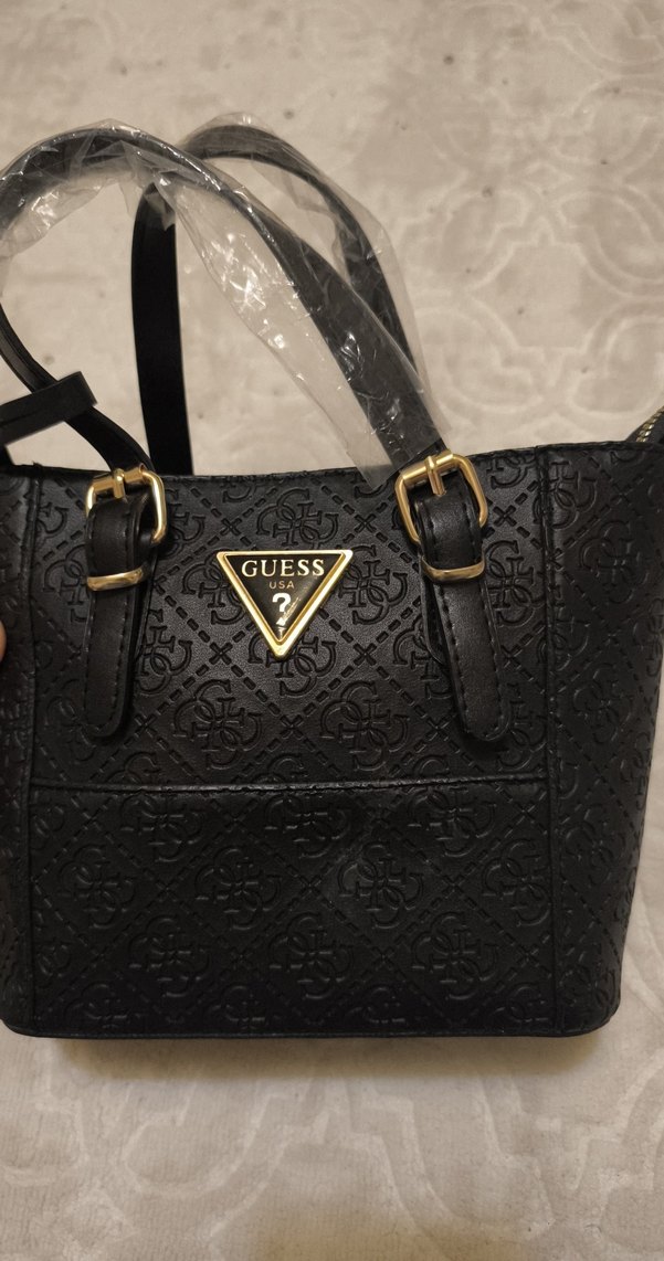Guess markalı, parlak siyah deriden yapılmış, tokalı ve desenli kadın çantası, klasik zarafetle gotik stili birleştirir.