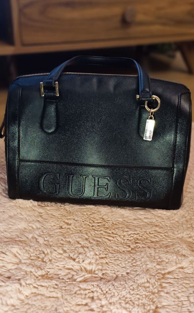 Guess siyah deri tokalı çanta, parlak yüzey, kabartmalı logo ve baskılı desene sahip, klasik şıklık için uygun.