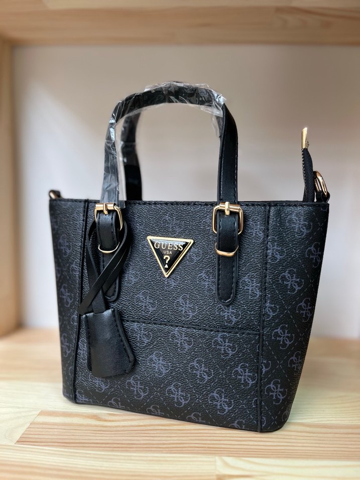 Guess markalı, parlak siyah deriden, desenli ve tokalı askılı günlük kullanıma uygun çanta.