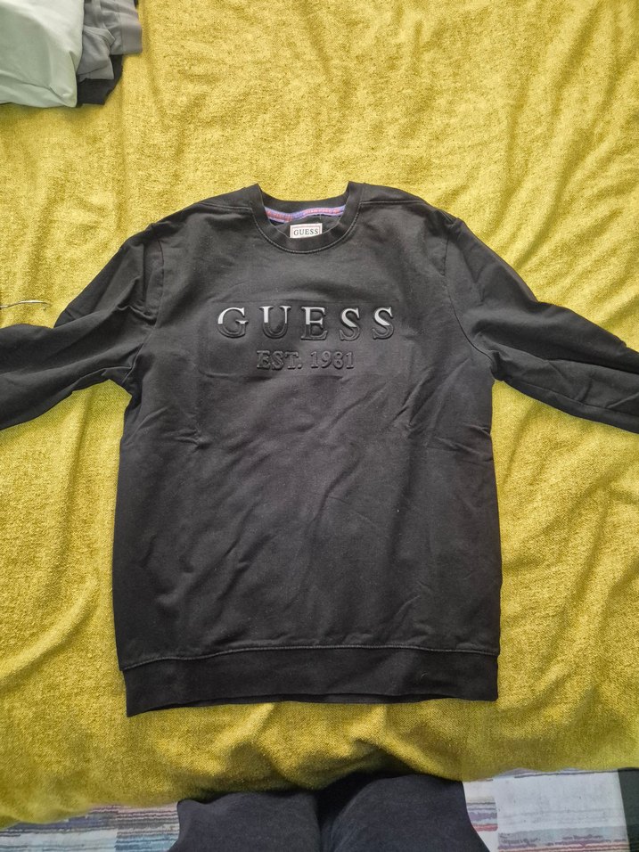 Siyah renkli, uzun kollu ve yuvarlak yakalı Guess erkek sweatshirt. Önünde 'GUESS EST. 1981' baskısı bulunur. rahat bir kumaşı vardır içi kalın değil spor kumaşı gibi