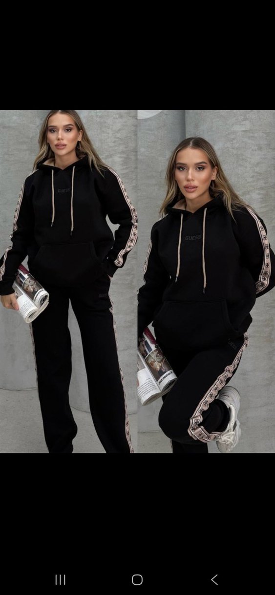 Siyah renkte, etnik desenli şeritlere sahip, kapüşonlu ve uzun kollu, bol kesim kadın eşofman takımı. Rahat sentetik kumaştan üretilmiştir.