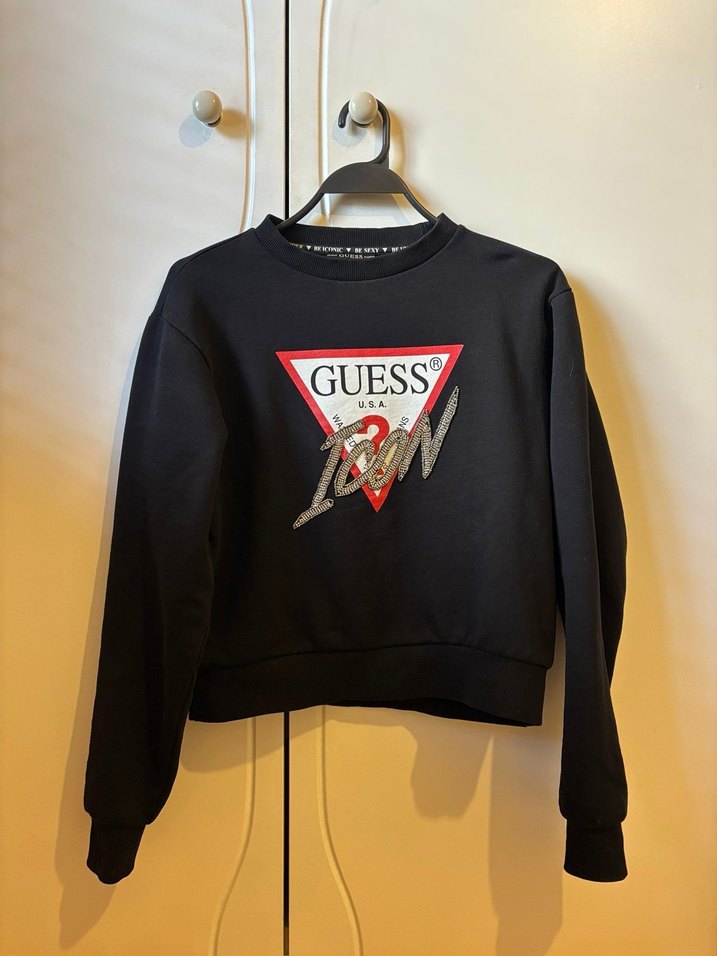 Siyah Guess sweatshirt, uzun kollu, yuvarlak yakalı ve bol kesimdir. Önünde baskılı logo vardır, yumuşak ve sıcak kumaştan üretilmiştir. Taşları eksiksiz ve tamdır. Tertemiz ve sorunsuzdur.