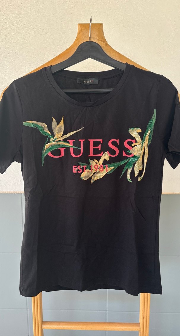 Guess marka siyah, kısa kollu, yuvarlak yakalı, bol kesim tişört. Parlak çiçek baskısı ve marka logosu ile dikkat çeker.