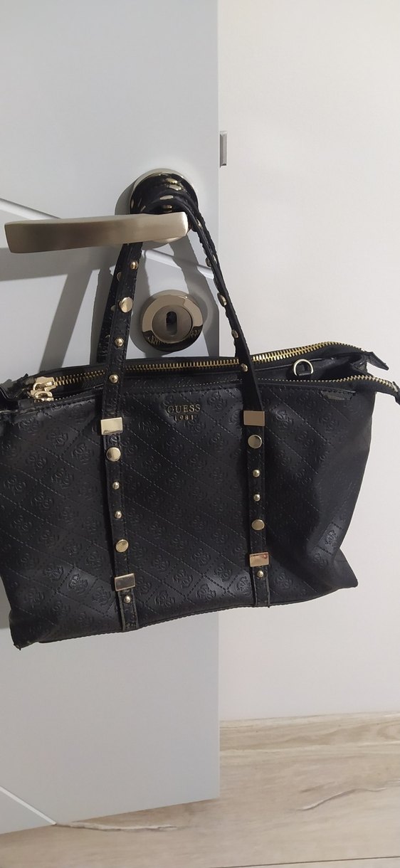 Guess markalı, parlak siyah deri ve desenli yüzeye sahip, tokalı askılarıyla Paris tarzı gotik ve cesur günlük kullanıma uygun kadın çantası.