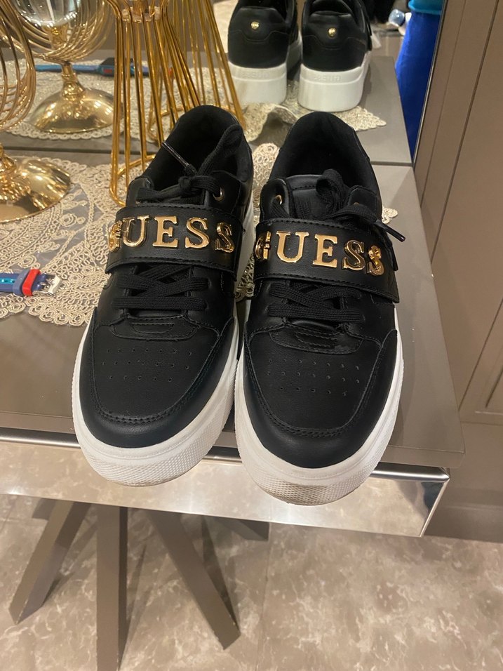 Guess siyah platform spor ayakkabı, parlak altın renkli yılan desenli cırt cırtlı bantla. Kauçuk taban, trend şık görünümler için sağlam destek sağlar.