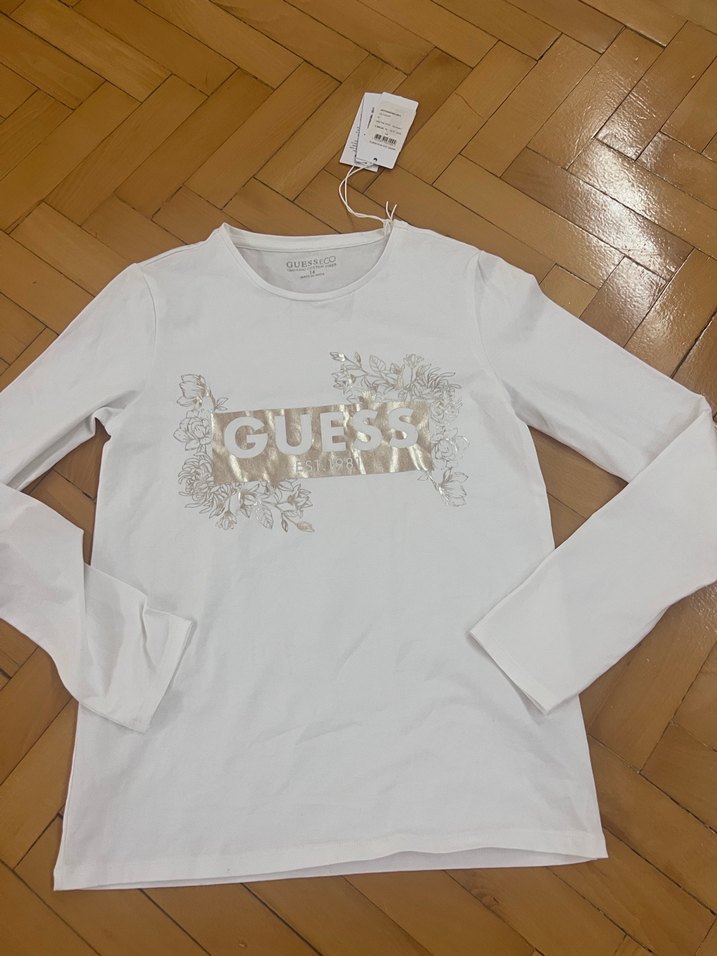 Pamuklu, uzun kollu, ince kesim beyaz kız çocuk tişörtü. Önünde parlak taş işlemeli GUESS baskısı bulunur. Sokak stiline uygun rahat bir tasarım.