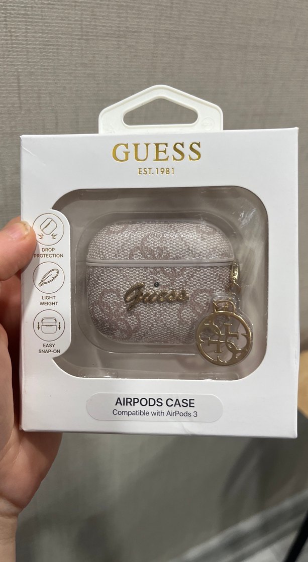 GUESS markalı, vintage tarzda parlak gri AirPods 3 kılıfı. Kolay takılan ve altın detaylı şık tasarım.