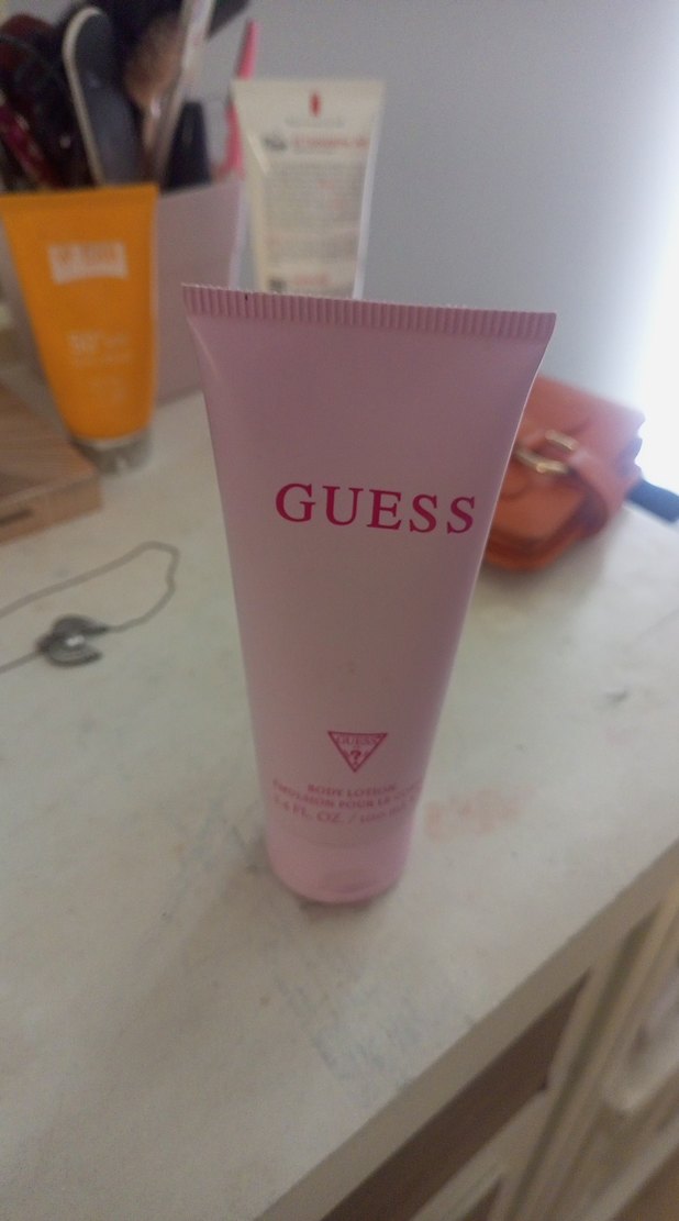 Guess markalı, yumuşak pembe tüpte vücut losyonu, cildi nazikçe nemlendirir ve bakım yapar.