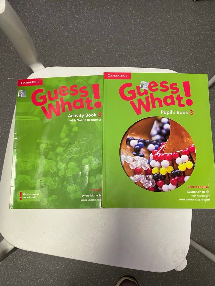 Cambridge tarafından Guess What! Pupil's Book 3, Activity book, iki kitap. renkli görseller ve ilgi çekici etkinlikler içerir. Başlangıç seviye. Öğrenci kitabında bir kaç sayfada kısa notlar var. Onun dışında tertemiz. Activity book sıfır tertemiz