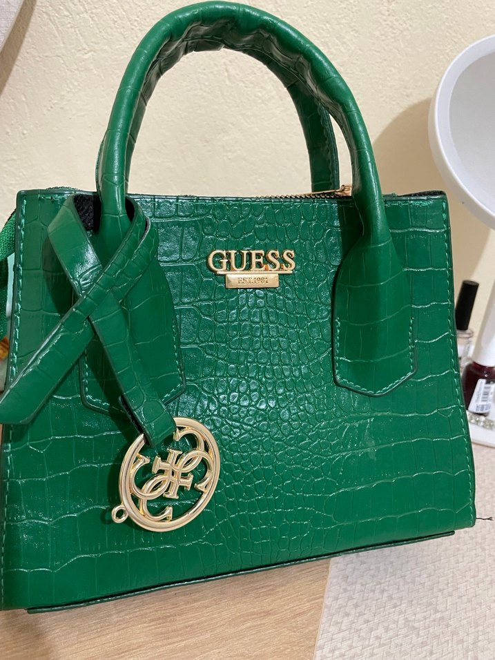 Guess markalı yeşil deri çanta, parlak kabartmalı desen ve tokalı detaylara sahip, klasik zarafetle sokak stiline uygun. Hiç kullanılmamıştır