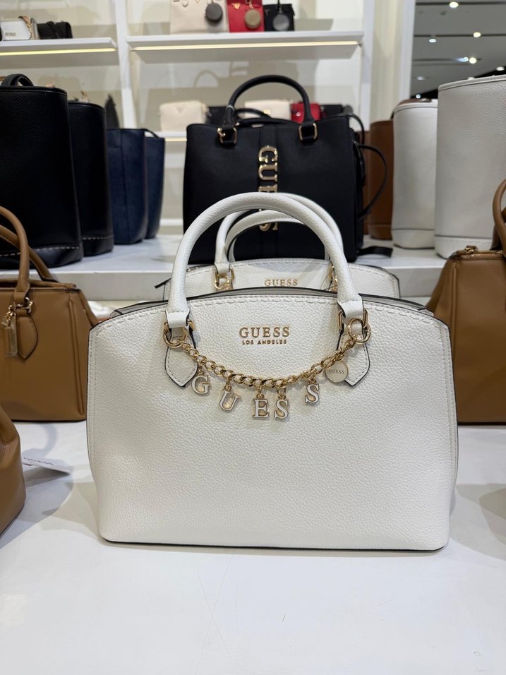 Guess markalı, zincir detaylı beyaz deri çanta parlak yüzeye ve baskılı desene sahiptir. Modern klasik tarzda, günlük iş kullanımı için uygundur.