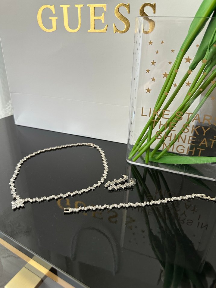Guess markalı, zincir detaylı, hafif beyaz renkli, baskılı kadın takı seti, düğün ve özel günler için uygundur. ✨