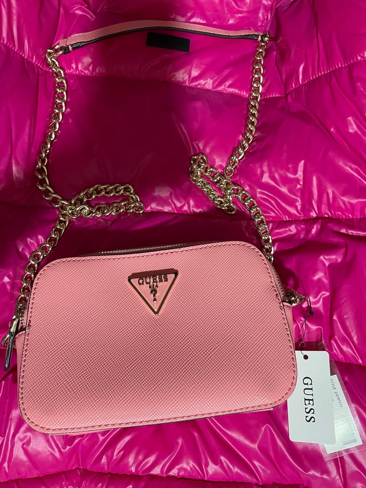 Guess markalı, pastel pembe sentetik kumaştan, zincir detaylı ve baskılı kadın çantası. Sokak stiline uygun, günlük kullanıma ideal.