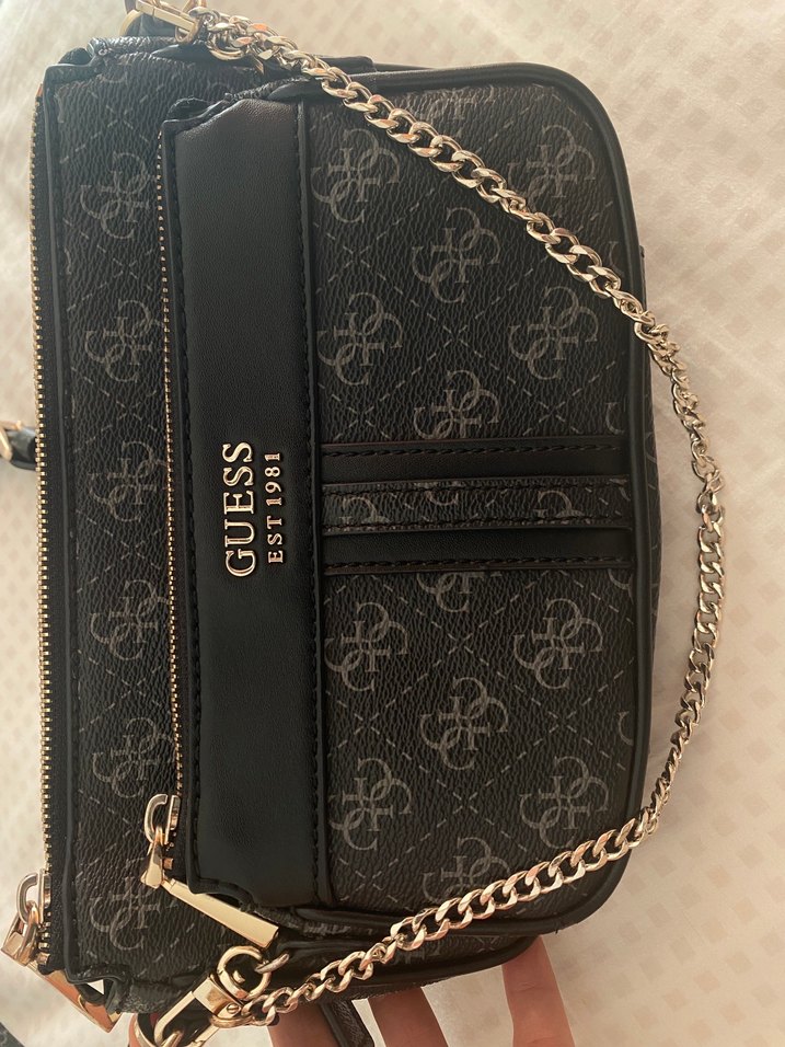 Guess marka siyah baskılı deri kadın çanta, zincir detaylıdır. Paris tarzını yansıtan, günlük sokak modasına uygun bir çantadır.