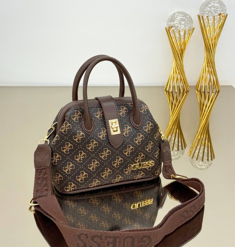 Kahverengi deri çanta, parlak baskılı deseni ve tokalı kapanışıyla dikkat çeker. Kulpları ve çıkarılabilir askısıyla farklı taşıma seçenekleri sunar.