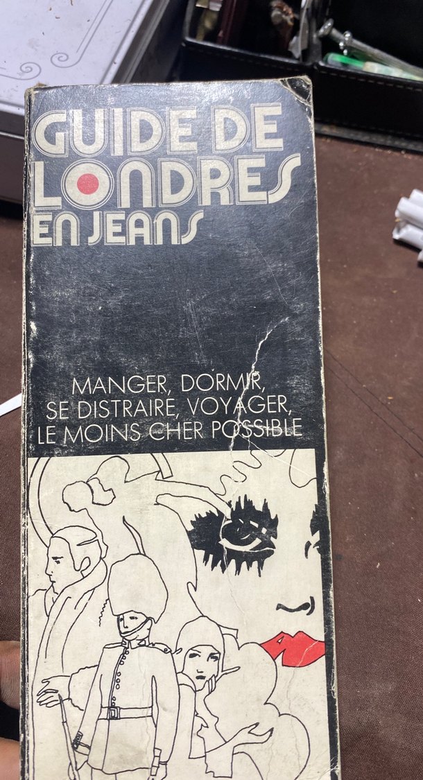 Guide de Londres en Jeans adlı bu mizah kitabı, Londra'da yemek, uyku, eğlence ve seyahat için en ucuz yolları anlatıyor. Kapakta sanatsal çizimler var.