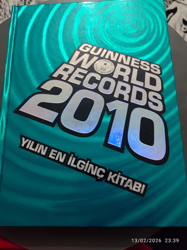 2010 baskısı Guinness Dünya Rekorları kitabı, parlak turkuaz kapaklı ve yılın en ilginç rekorlarını içeriyor.