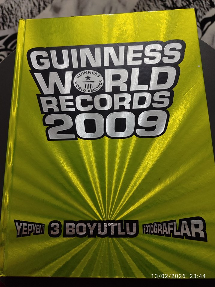 Guinness World Records 2009 kitabı parlak kapaklı ve canlı 3 boyutlu fotoğraflar içerir. Dünya rekorlarını detaylı görsellerle sunar.
