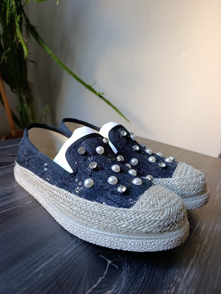 Mavi kot kumaş, işlemeli ve boncuk detaylı platform topuklu kadın sneakerı, günlük bohem sokak stili için uygun.