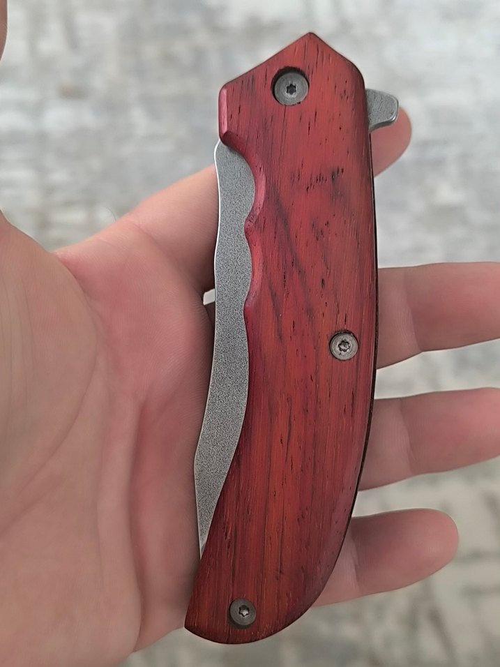 Bordo renkli ahşap saplı katlanabilir cep bıçağı, metal bıçak ve tutuş kolaylığı sağlar. Kompakt yapısıyla taşıması rahattır. 25 cm tam boy dövme celik