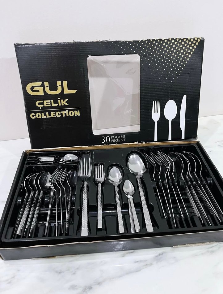 Gül Çelik'in 30 parça çatal, kaşık ve bıçaktan oluşan, dokulu saplı koyu gri renkli çelik seti.