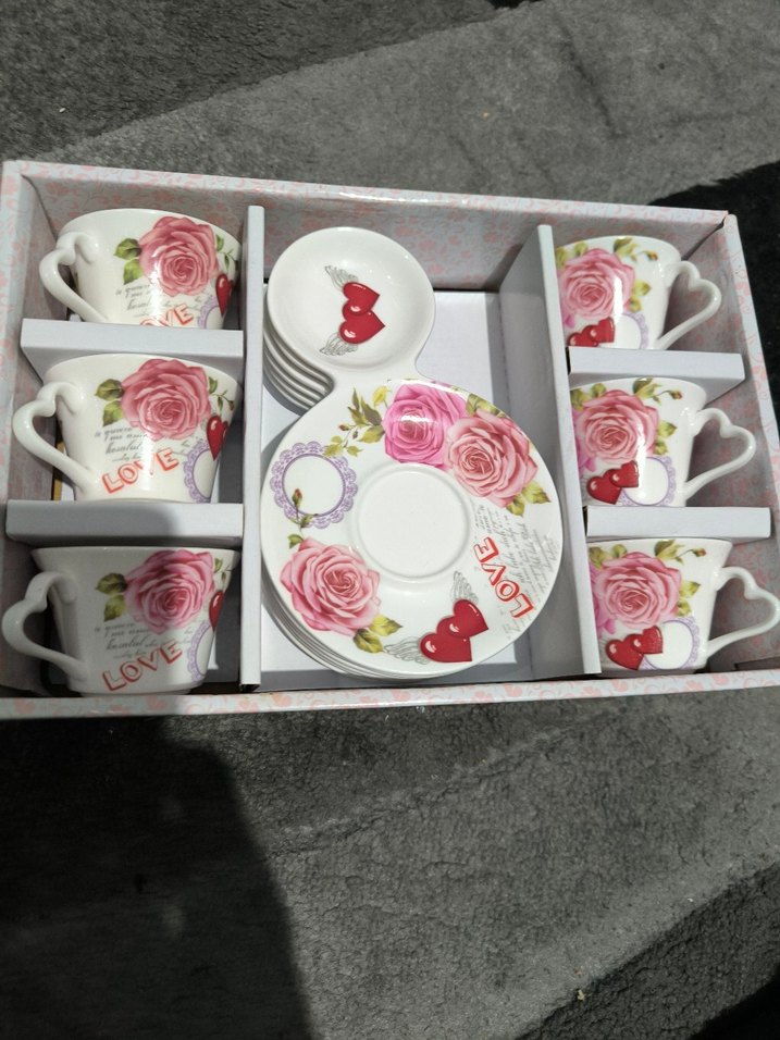 Pembe güller ve kırmızı kalplerle süslenmiş, 'Love' yazılı beyaz 6'lı fincan ve tabak seti. kahve servisinde kullanılabilir. glass in love marka .kızlarımın ceyizlikleri satıp başka ihtiyaclarini alicam sayfamda çok sayıda fincan takımı var bakın lütfen