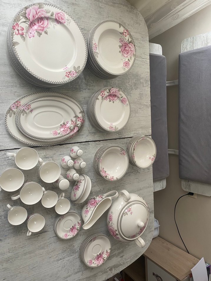 Bu beyaz porselen yemek takımı, narin pembe gül desenine sahip olup tabaklar, kaseler, fincanlar ve servis tabakları içerir. Şık sofralar için ideal ️.