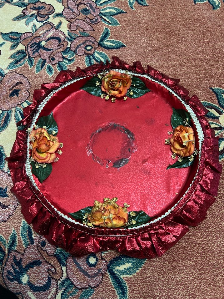 Kırmızı saten kaplı, etrafı fırfırlı ve güllü detaylara sahip yuvarlak geleneksel el işi kına tepsisi