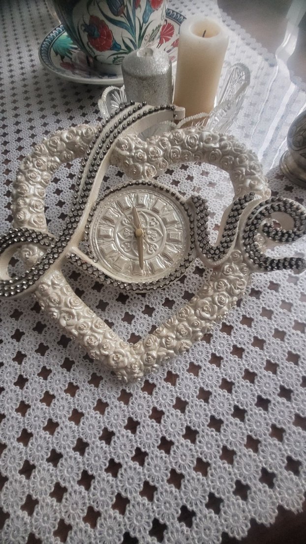 beyaz duvar saati, kalp şeklinde ve ince gül süslemeleriyle zarif bir görünüm sunar. ️