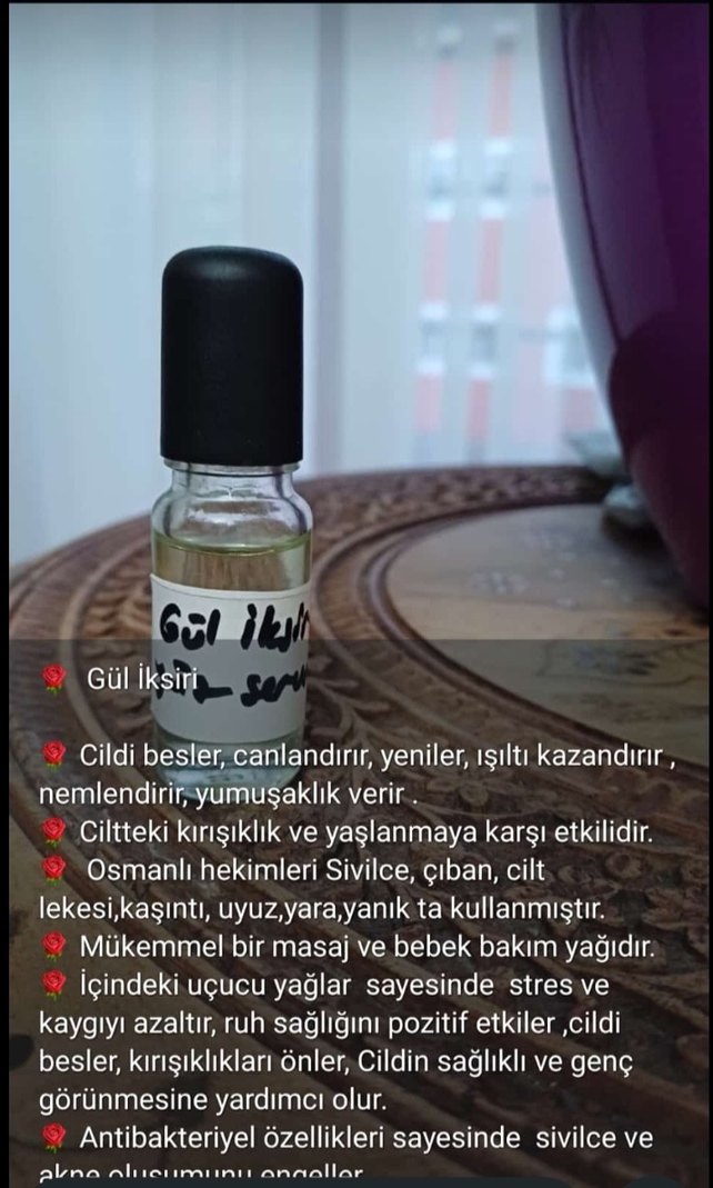 İçindeki uçucu yağlar sayesinde stres ve kaygıyı azaltır, cildi besler, canlandırır, nemlendirir, kırışıklık ve yaşlanmaya karşı etkilidir. Osmanlı hekimlerinin kullandığı, cilde parlaklık ve yumuşaklık veren gül iksiridir. %100 doğal el yapımı