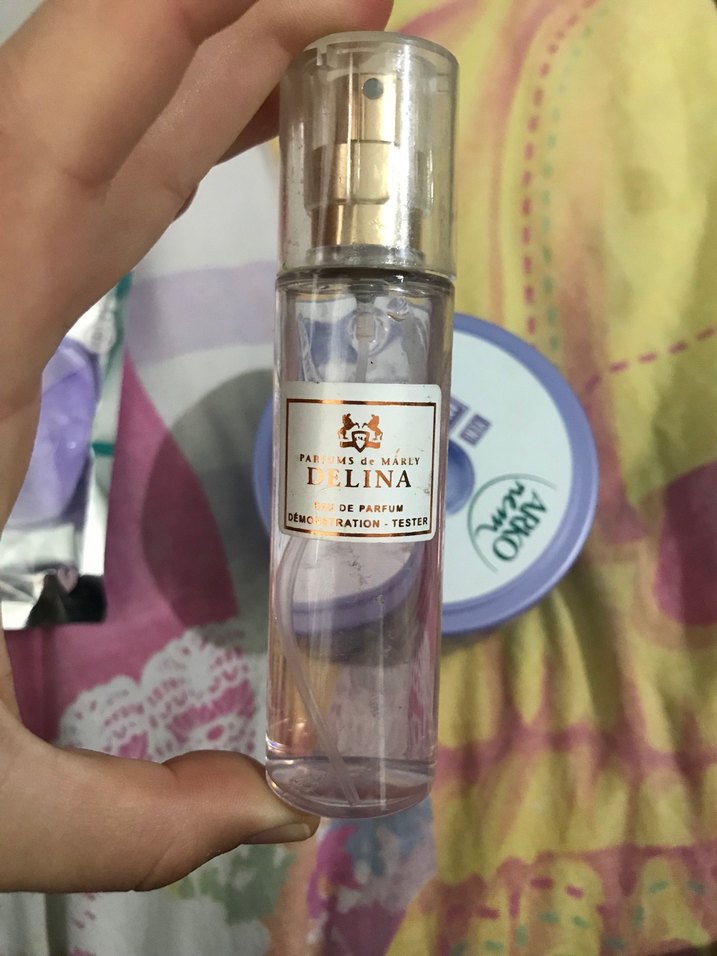 Parfums de Marly Delina kadın parfümü, şeffaf cam sprey şişe ve altın detaylarla. Zarif bir koku deneyimi sunar.